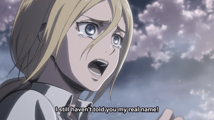 Christa Renz, now officially Historia Reiss in the Attack on Titan anime, has been putting up a facade as well. At a surface level, her comrades see her as a strong and compassionate woman, standing up for others as she did for Sasha when Ymir bullied her. But inside, Christa isn’t who she seems. She’s running away, fearful. And in episode 30, we discover what she’s hiding from: Christa is afraid of her name.