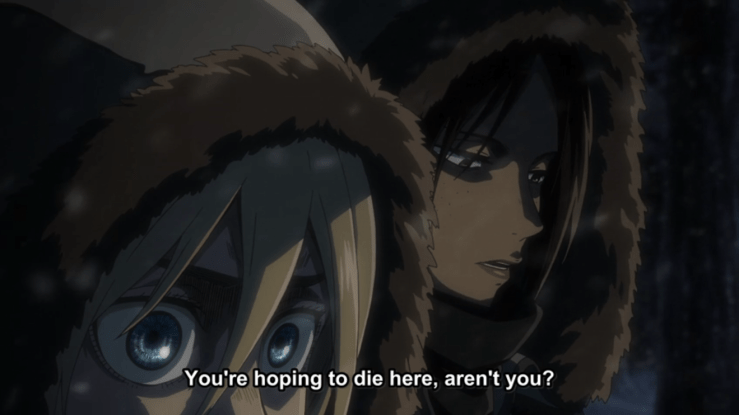 There’s one person who sees through Christa, however. From the beginning, Ymir has known the real person behind those humongous blue eyes, the truth underneath the well-crafted exterior. She can even tell that Christa has a death wish of all things! And despite that, Ymir continues to cling onto her, explaining in a de facto way that she isn’t obsessed with Christa because of her beauty, but because of who she is.