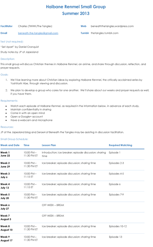 1. Wow, well planned! it looks great, I won’t be joining though i’m a non-religious person but seeing an Anime Discussion… a scheduled Anime discussion as well organized as this makes me want to hold one myself. Oh sorry for being “over-the-top” my first time seeing Anime being taken seriously. We need more of this in the Anime Community goodluck on future endeavors ^__^