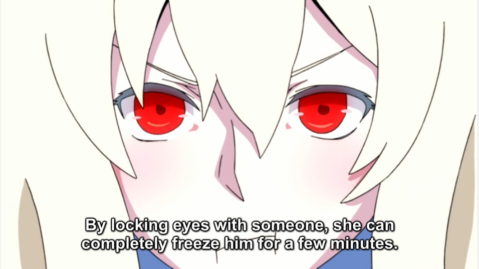 In short, all the members of the Mekakushi-Dan (five as of this episode) have some sort of super-power, which is often related to their eyes, and their eyes turn red when they use it. Momo and Kido’s powers are opposites, with Momo having the power to attract attention and Kido having the power to avert it.