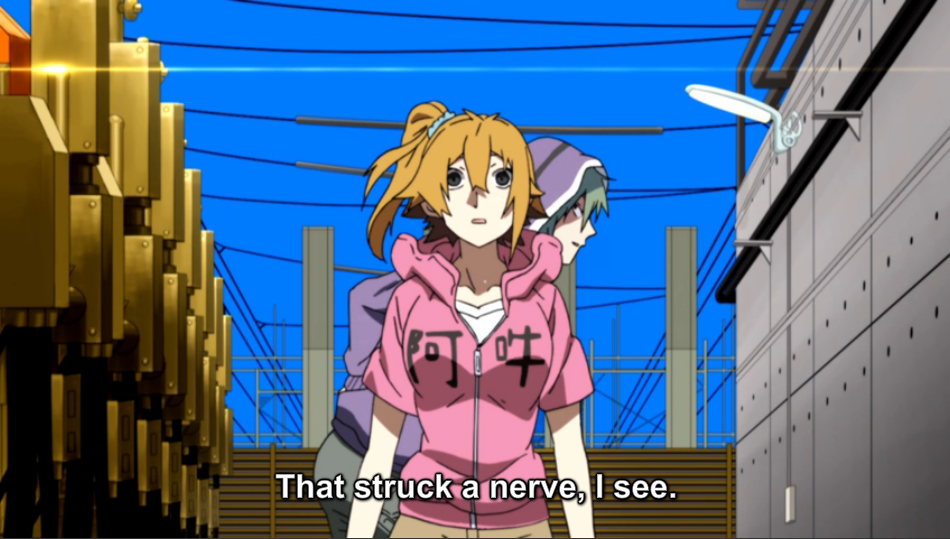 I loved this episode. If all the rest of the episodes could be like this one, I would be content. I loved the witty dialogue between Kido and Momo. I checked the manga, and it was not nearly as good. Since Jin is writing the script, I assume that this is an improvement on his part, which is nice to see. It wove seamlessly into the plot of the first episode, and the characters were great. I felt like they displayed Kido’s power with originality that I haven’t really seen used in invisibility powers before. I was impressed.