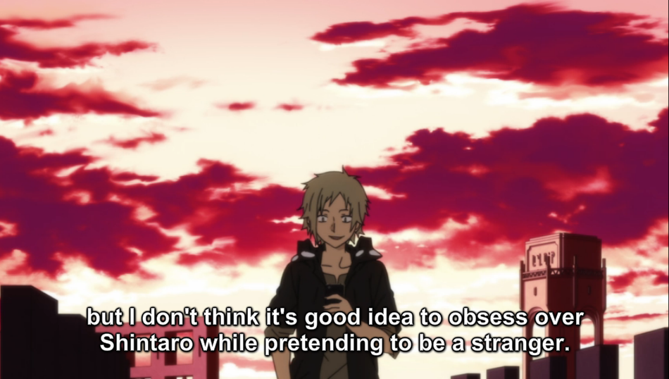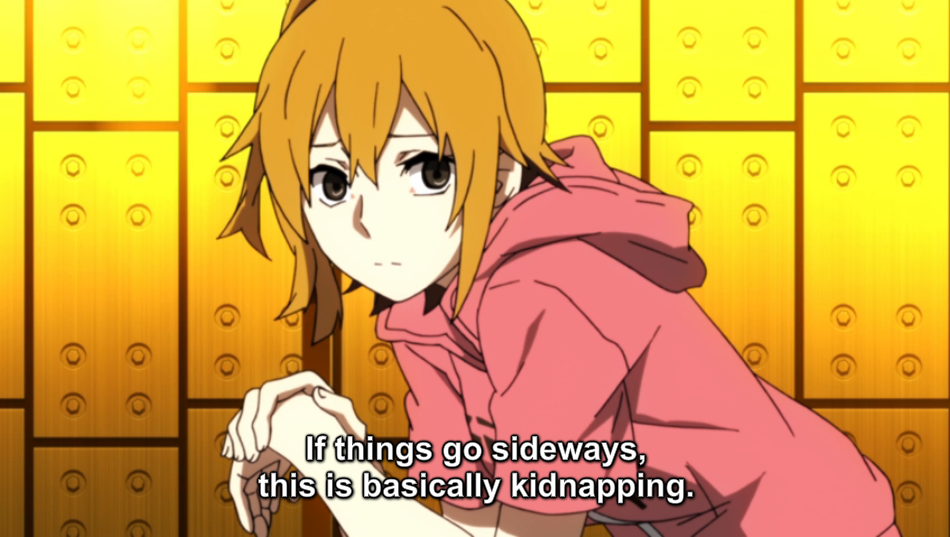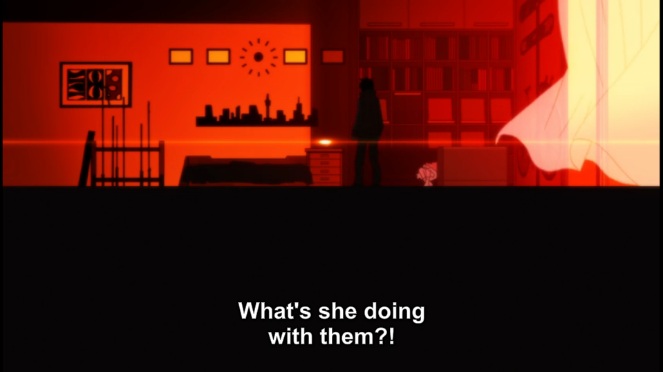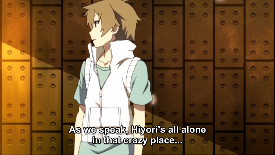 Kido mentions Ene, and reveals that she was once human, without giving anything away. Kido explains that those who don’t escape the void seem to have vanished, but the general goal of the Mekakushi-Dan is to get them back. Hibiya enters, and, hearing that Hiyori is still trapped in the Daze, runs off. Kido and Momo pursue him, leaving Shintaro to wait.
