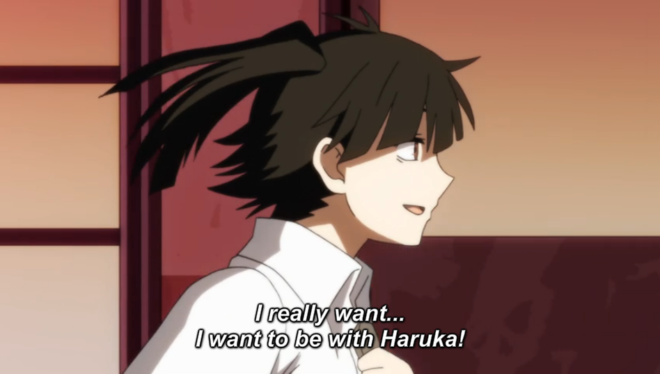 As she is wallowing in shame, she runs into Ayano, who has also been attending supplementary summer classes. They talk about school and Shintaro, and eventually Ayano confronts her about her fear of being rejected by Haruka, and encourages her to tell him how she feels.