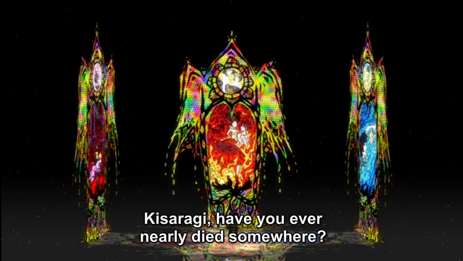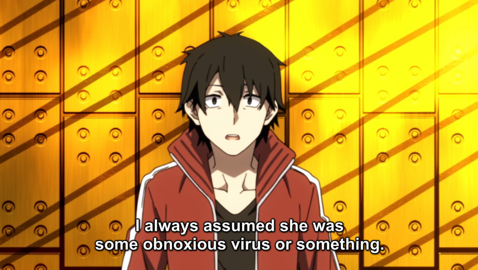 When Kano begins to point out that Ene’s experience of becoming a cyber-being was similar to their experience when they received their eye powers, Seto calls to tell them that Shintaro and his friend were involved in a traffic accident.