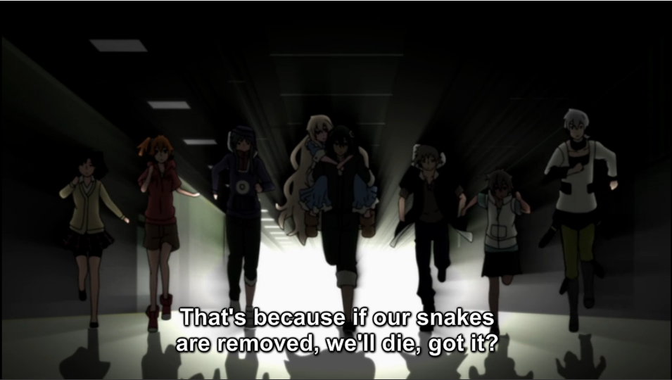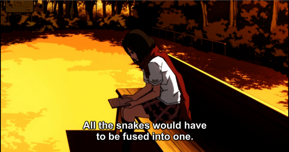 Kano walks alone, pondering the events that led up to Ayano’s death. Ayano told him she had figured out that their father’s snake (It’s not mentioned in-anime, but this is the Snake of Clearing Eyes, who also was the one who convinced Azami to make the Heat Haze Daze.) was trying to grant Kenjirou’s desire to bring Ayaka Tateyama back to life, but in doing so, all of the other people possessing snakes/eye-powers would die.
