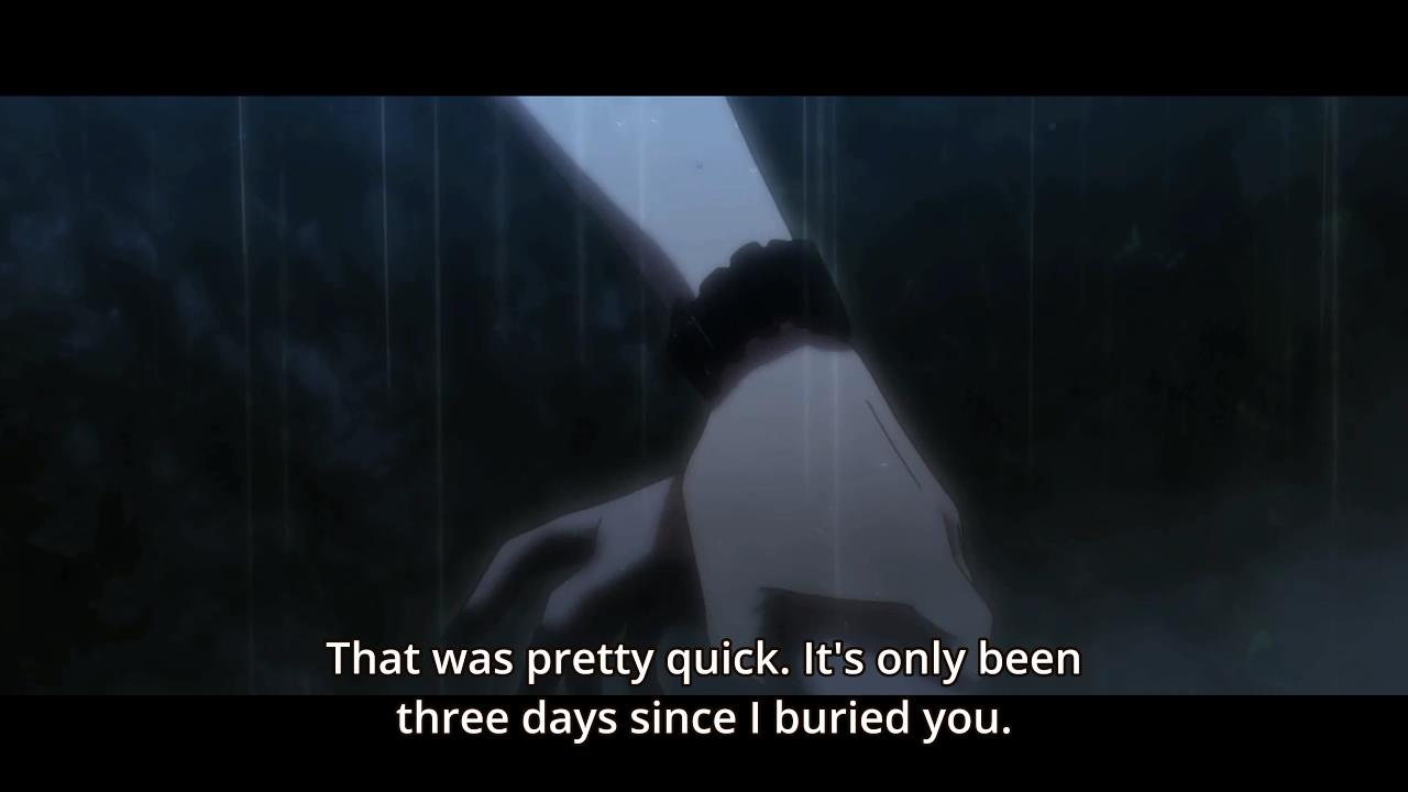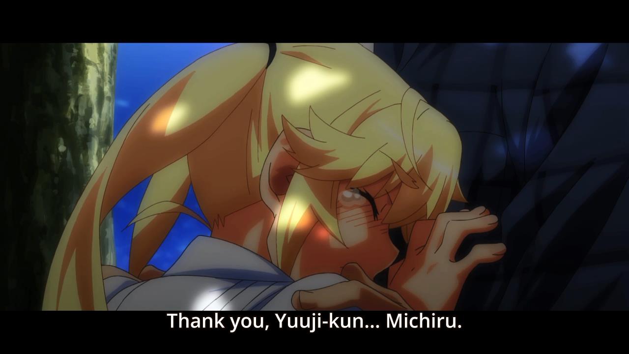 Back in the coffin, Michiru is scared of the small confines, but the other her reminds her that this is what she wished for. Furthermore, the memories of her dead friend still haunt her. Michiru then finally admits that her friend is already dead, and she cannot continue living trapped in the past. With her own power, she forces open the coffin, saying that she doesn’t want to die and wants to see everyone again. Yuuji appears by her side, saying it’s only been 3 days since she’s been buried. He explains that he knew she wanted to live and he had been waiting beside her for the entire time. He also explains the medicine he forced her to take was just candy, and that her personality coming out was because she truly wanted to.