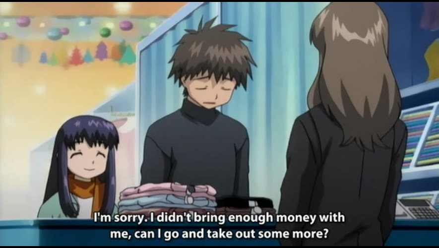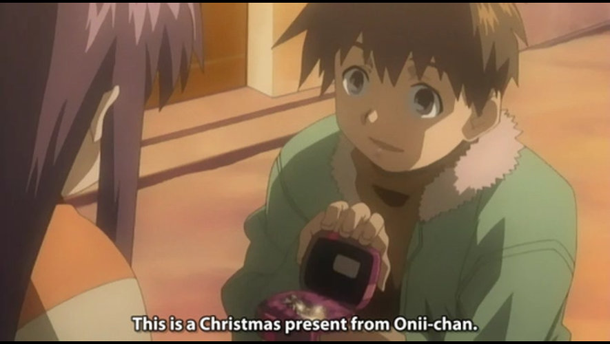 Perhaps more than anything, this first episode (and I watched only the first episode) is about Haruma’s long-dormant desires to show love to the little sister he always wanted but never thought he’d have. For Haruma has the same wants and needs as any other teenage boy — wants and needs which now need to be viewed in the light of his new status as aniki. With perhaps the last of what little remaining money he has, Haruma purchases a brooch, for which he has big plans.