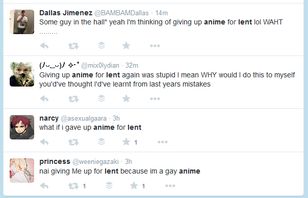 I gave up anime the first year I seriously practiced Lent and it was definitely a positive experience. I didn’t do anything for Lent again until two years ago and now basically I take away what I took away the previous year in addition to taking away something new, and then I also add some type of scripture reading.