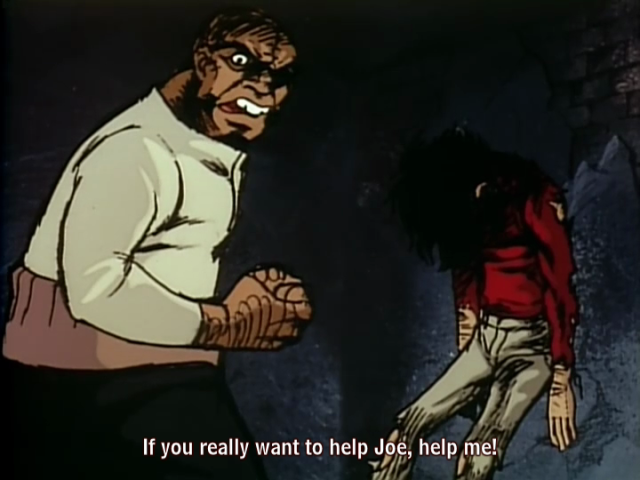 To make this journey of conversion more difficult, our hero throws up every possible obstacle he can. In Joe’s trial, it comes to light that Joe was abandoned by his parents at a young age, escaped from his orphanage, and has since lived as a drifter relying upon his fists and his street smarts until about his seventeenth year. This life in nowise may be expected to produce a gentle heart! Yet, he has the good fortune of meeting Danpei Tange, a retired boxer living as a homeless drunk. Danpei becomes enamored of Joe’s fists, and persists in persuading Joe to take up boxing. The first person to show Joe any kind of affection in a long time, Danpei does things like cover him with his overcoat when Joe goes to sleep and shields Joe from a beating by interposing his own body, which sends Danpei to the hospital. When at last Joe caves in to Danpei’s entreaties, Danpei becomes Joe’s guardian and works night and day so that Joe might concentrate on training. At the same time, a group of brats (I’m sure the Japanese term gaki applies to them) befriends Joe, but this association does not lead Joe to become a better person–despite the sincere affection the kids have for Joe.