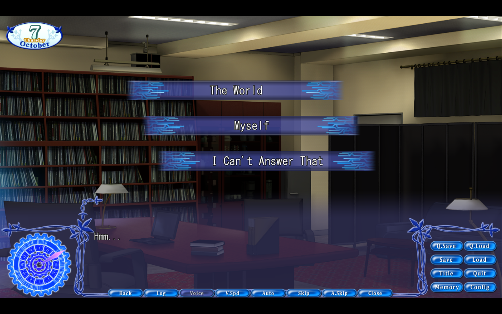 Before that, though, earlier in the story, when being questioned in the occult room upon his first entrance, Kotarou is given a question that is fundamental in determining his interactions later on in the routes, when the situations are much more dire and Kotarou’s worldview comes to the forefront. This question is: