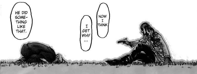 Kenny looks back at Uri’s sacrifice and forgiveness and is inspired to do the same. Having found the secret to Uri’s “power,” Kenny makes peace with his nephew and at last lets go of his desire to find further fulfillment in his life. In essence, he repays Uri’s kindness by sacrificing his own life in order to give Levi the titan shifter serum—the same serum that might have prolonged his own existence. Kenny’s last words are an admittance of his short-comings… and an unstated plea for forgiveness.