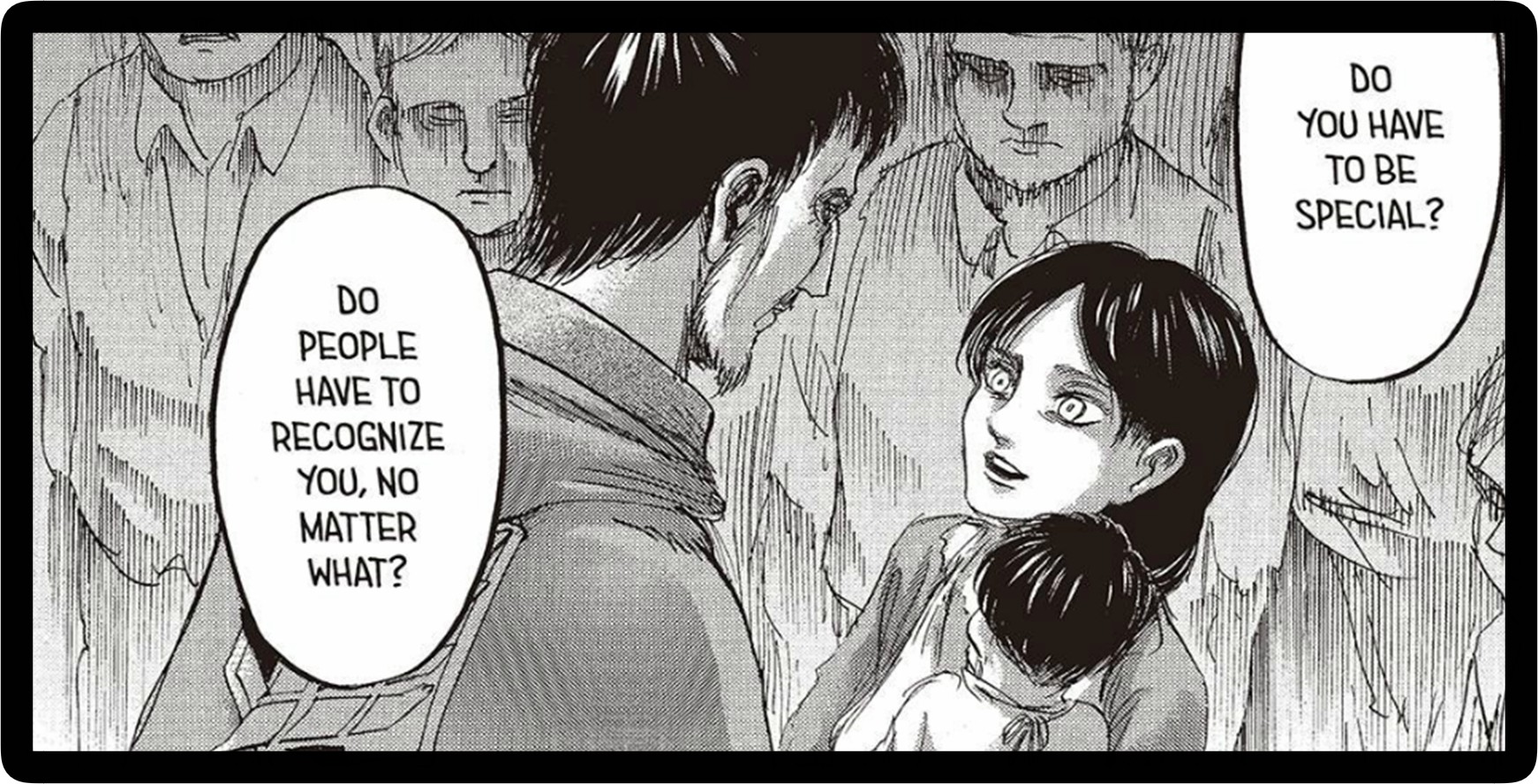 “Do you have to be special? Do people have to recognize you no matter what?” Gazing at the small Eren Yeager in her arms, Carla continues, “He doesn’t need to become great. Just look at him… He’s already great because he was born into this world.”