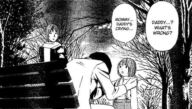 By the chapter’s end, he’s crying brokenly at the sight of his family. It’s most painful to watch because Aizawa seems to realize that he’s misplaced trust in his own abilities and misjudged L’s care for him. His family may be his most important possession, but remaining on the task force alongside L would have been the only way to truly protect them. Alone, he can do next to nothing. He can’t stand and fight Kira the way that L can. His lack of faith has caused him to play the coward.