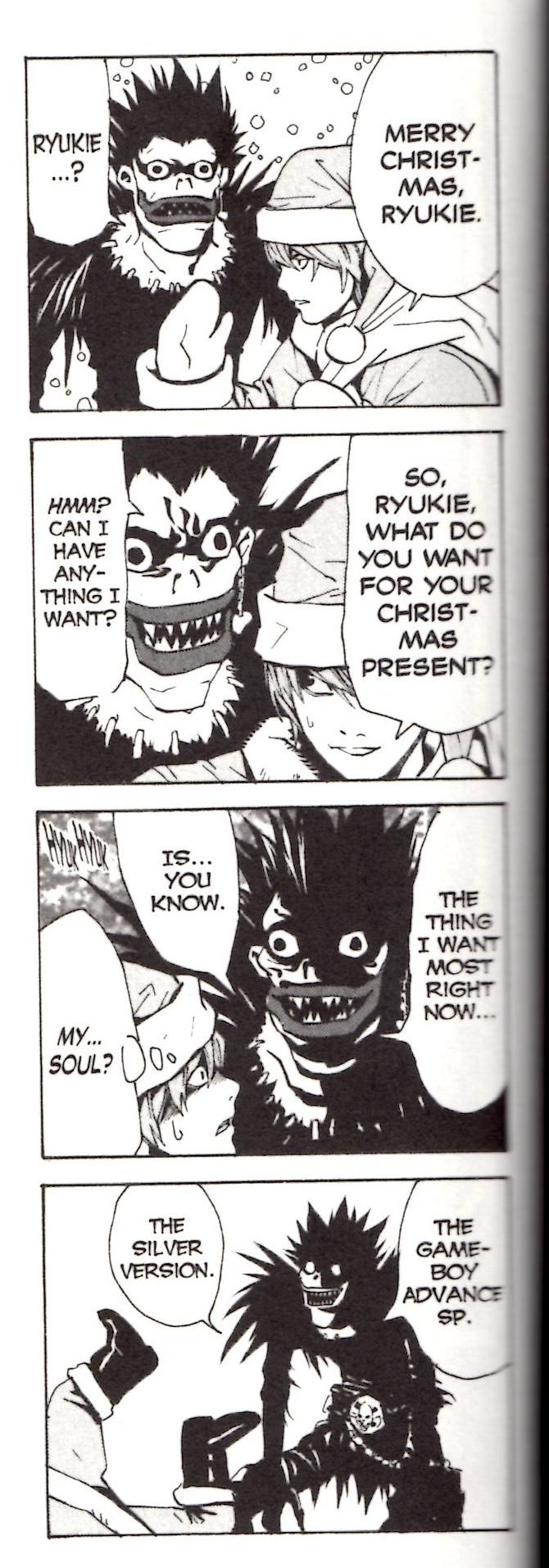 Apparently, decorating your tree with handheld video game systems is a thing in the Death Note universe… Matt probably started it.