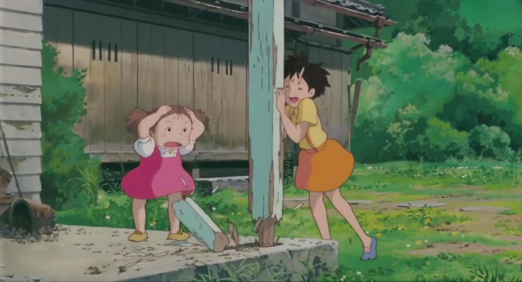 If you haven’t seen this film, you may not have heard much about how it starts: Satsuki, Mei, and their father arrive to the countryside, near the hospital where their mother is staying. They move into an old, rotting house—and they couldn’t be happier about it. They run from the vehicle and immediately notice the simple and beautiful: “Look! a creek!” Satsuki calls to her sister.