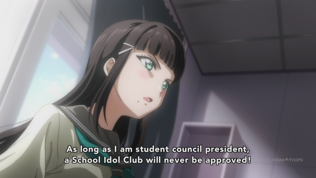 Just like in the original Love Live, we also have a student council president, Dia, who is very much opposed to Chika’s forming a school idol club, thinking that it is frivolous. Whether she will come around later… of course she will. The only question is how…
