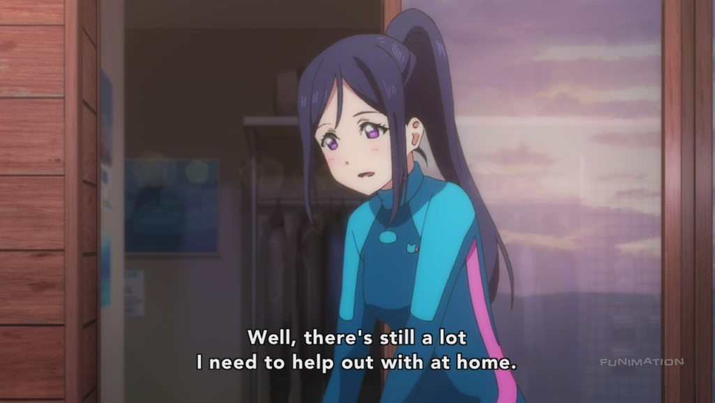 The real highlight of this episode is just past the halfway point, where Chika meets Riko for the first time, as the latter tries to go swimming to hear the sounds of the ocean for musical inspiration. During their conversation, Chika talks about how she first got interested in becoming a school idol. She had always seen herself as a “normal” girl, with no standout traits or skills (especially compared to You, who was a talented diver even as a child). Then, one day, she saw μ’s’ performance of START:DASH!! from the end of season 1 of the original anime, which is notable in that they all performed it in their school uniforms instead of any flashy idol costumes. That is what particularly inspired Chika, as she realized that the girls in that performance, like her, were all rather normal, and yet they could still put on a dazzling performance.