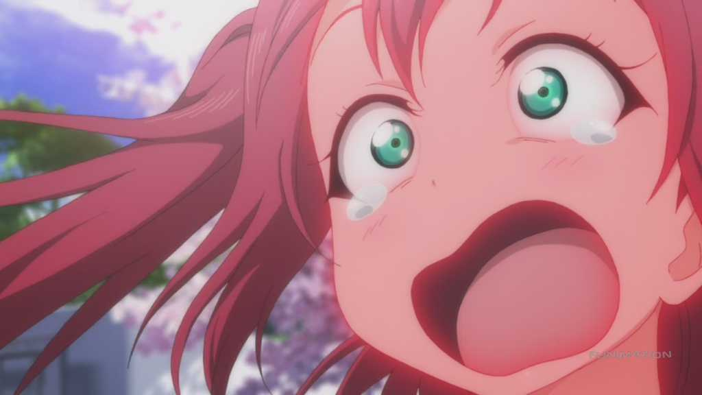 So that’s enough character introduction… let’s talk more about the episode and this show in general. One thing that I should mention is that Love Live! has a particular storytelling style to it; the best way I can describe it is that it is the anime equivalent of a musical. This means that a lot of the characters’ words and actions are exaggerated for theatrics. It certainly adds to the fun of the show, and compared to other idol shows, Love Live! has always been more about being fun than anything else. This, of course, culminates in the random musical number we get at the end of the episode (which seems to take place all in Chika’s imagination), similar to how the first episode of the original anime ended with Susume->Tomorrow.