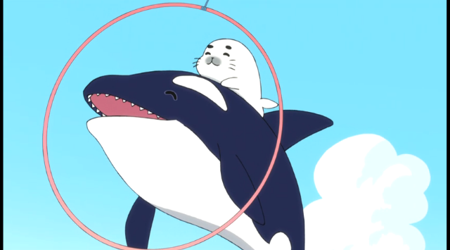 Shounen Ashibe GO! GO! Goma-chan is a short-form series for kids about a 1st grade boy and his pet seal. Yes, that is the basic premise of the show. Yes, it’s weird that a 1st grader has a seal. He also brings said seal to school, to the bathhouse with his Dad and friends, and to the aquarium (which is where the screen shot comes from). The series follows Ashibe immediately after moving to a new town. It also follows his friend he left behind, Sugao, whose adventures without Ashibe start off sad, but turn into some fun moments with Yeti sightings! As someone who likes short form anime, this was an easy one for me to get drawn into. Yet, the real reason I was interested was to see if my kids would like it.