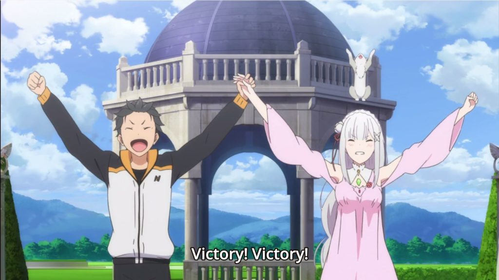 So, I honestly picked up this show half expecting that I’d have to drop it. When I read the description and got to the bit about “a mysterious beauty named Satella” saving Subaru, I started worrying that this show would turn into some fanservice-filled plot-light story-light tale of the dumb but lovable protagonist and his “mysterious beauty” savior/new girlfriend. So far, I am happy to say I have been proven wrong! I gave the show a shot, despite my doubts, due to the explanation that Subaru keeps reliving the same scene(s). As someone who loves Doctor Who for the beautiful paradoxical, time-jumping story arcs, this concept really drew me in. I’ve gotta’ say, the show does a really good job of it, too! The plot was a bit slow for about 3 episodes (basic explanation of backstory to show where Subaru is and how he keeps reliving the same things) but episode 4 picks up the pace and it hasn’t slowed down since!
