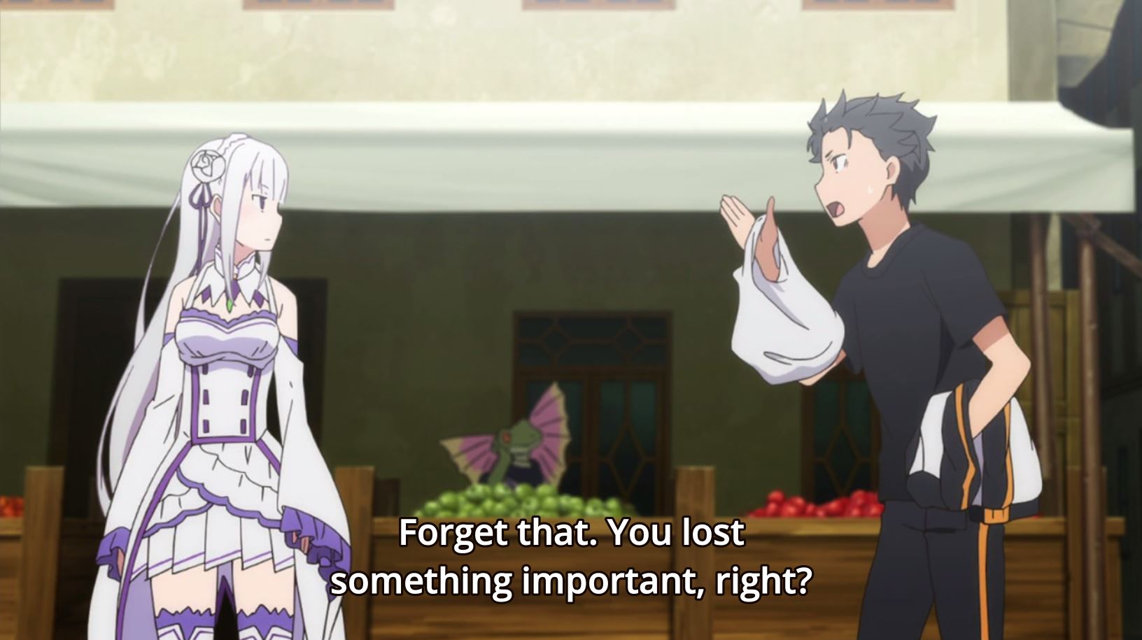 1. Er, you musta’ mistread… it’s not TECHNICALLY about a game. It’s just set in a world very similar to the typical MMORPG world. Although, elements of it ARE a lot like a game (e.g. coming back at “checkpoints” if you die, having different “quests” or “goals”). There basically are just a lotta’ references – and Subaru himself thinks he’s in a game (hence whining about lacking his “protagonist status” that main game characters get – superpowers, etc.)