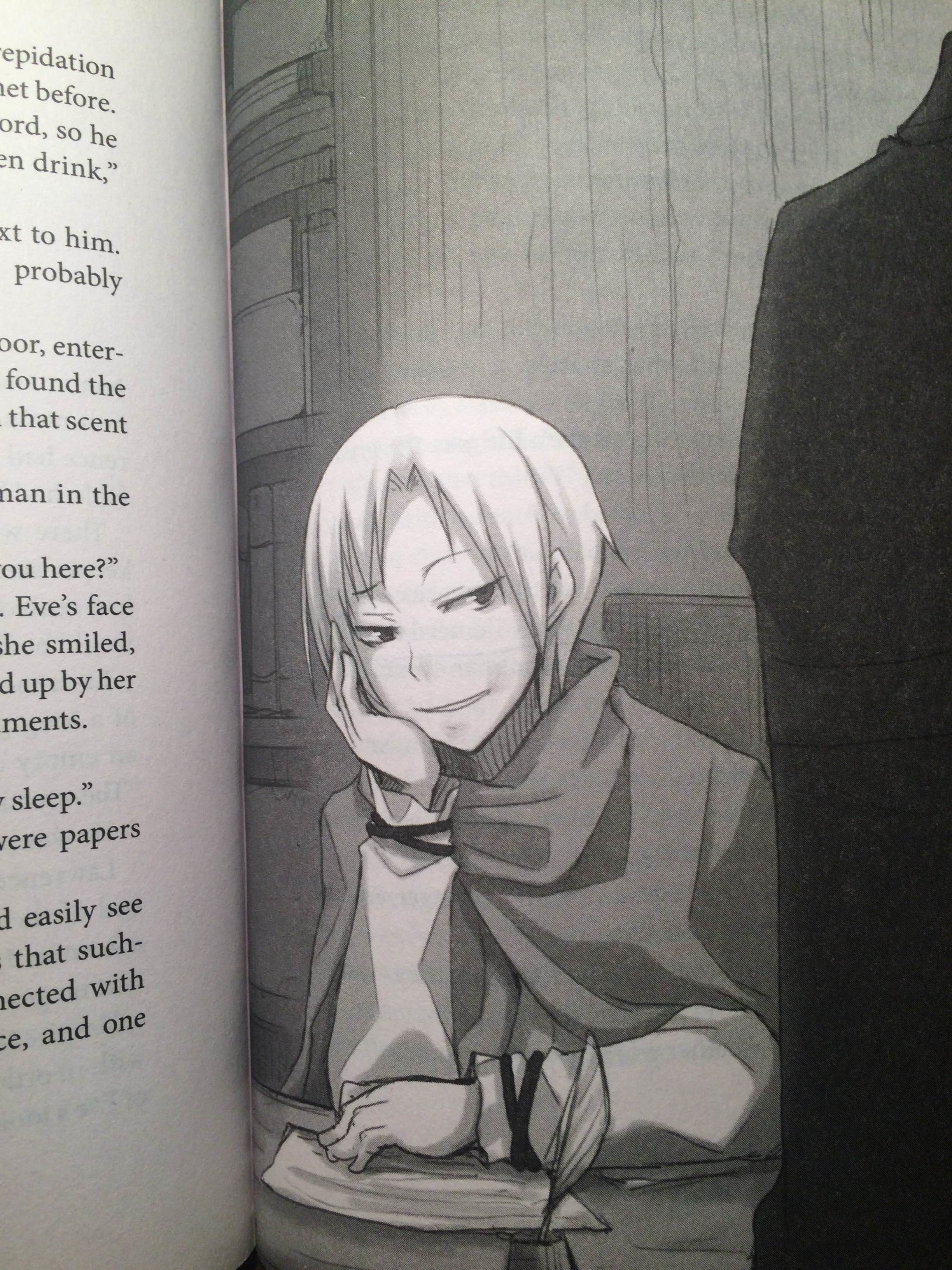 The ninth volume of Spice and Wolf takes place in Kerube and concerns some dangerous business with Craft Lawrence caught in the middle of two antagonists: Eve Bolan and Kiemen, the head of Lawrence’s guild in that city. Those of you who have read the books or watched season two of the Spice and Wolf anime know about Eve Bolan, the cunning merchant who disguises herself as a man. *Spoiler* You also know that she previously tried to knife Lawrence to death. *End Spoiler* Despite Lawrence and Eve’s past problems, the two admire one another. Lawrence even pities her, which is probably as much as one can love someone filled with so much self-hatred. Both Eve’s past among the nobility and career as a merchant explain why she would lack reasonable self-love. However, being used, using others, and having all her energy set on profit makes her judge everyone on the scales of trade. The sole exception to this rule might be Arold, an innkeeper whose relationship with Eve prevents her from turning into the monster that is Kiemen.