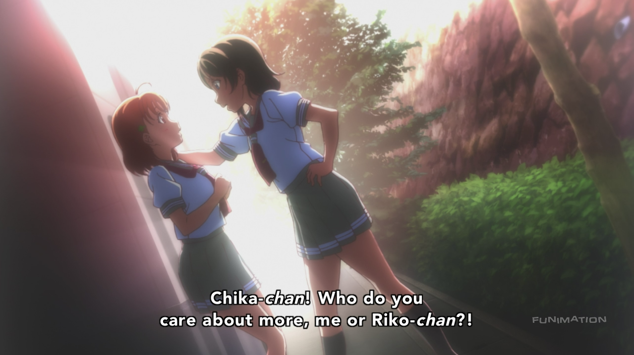 As such, I find this particular episode of Sunshine interesting in that, in many ways, it mirrors a common storyline of these “unlucky childhood friend” stories: friend meets new person, spends a lot of time with her, and seems to really enjoy being with her, while the old friend feels left out. However, with all the characters involved being girls and any romantic elements limited to jokes and delusions made to appeal to the show’s yuri-shipping fanbase, the scope of these feelings are still within platonic friendship. Without the burden of adhering to overused romance tropes, this episode is a perfect opportunity to look at the “childhood friend gets left behind” plot device in its purest form and see what we can gather from it.