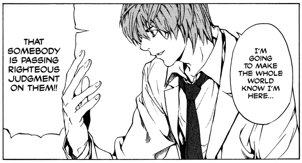 Fear is a powerful tool of the dictators of the world to prevent the people from rising up against them. Fear is what prevents us from stopping those who commit crimes right in front of us. Fear is what Light plans to use to establish order. He hopes that fear of him will lead to a more calm, safe society. He hopes that a people living in fear will be a people who are controllable in a better world crafted in his image. There is a big problem, though, which Light may not realize – he is not the one we should fear.