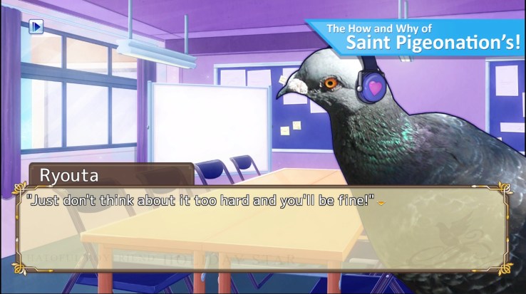 Anyway, I hope you do look at a walkthrough. And if you ever do decide to take the plunge and try Hatoful, I recommend getting it on Steam when it’s on sale for the price of a cheap coffee. There are many more amusing lines where the one I screencapped came from. Of course, Kaze may have a very different idea of which visual novel you should try first…