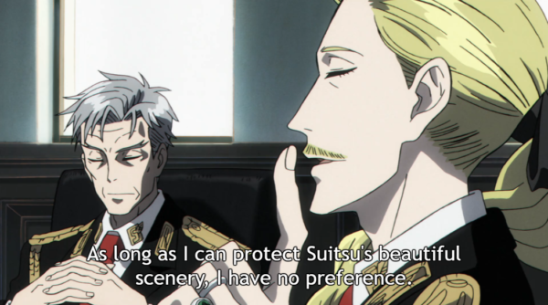 Dowa kingdom is a relatively peaceful country, and ACCA, in general, appears to be a decent organization. Of the districts Jean has audited so far, Jean only uncovered two problems. But if you look past the districts, which are hard to properly analyze as we spend so little time in them, you can see the five chiefs of ACCA, and what a mess they are. They may look calm and sophisticated, but they are terrible at working together. On top of not trusting each other, it seems like one is compelling another unwillingly to help him in a sinister plot, and they’re all so disconnected from each other that the other three don’t even suspect it. They don’t seem to care about anything but their own motives—From what we know, they’re all aware of the situation in Suitsu but not one of them feels sympathy for the people there. They might not be stupid, but their selfishness makes them inept.
