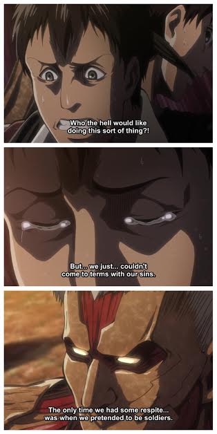 Yeah, but this is a qualitatively different situation than becoming your ancestors becoming skilled, ruthless killers because they *had* to kill, because those were the orders, because it was either them or their enemies. You can’t resist the pull of that situation, or you will die. There is little room for complacency of any kind whatsoever. You’re either guilty or dead. When you and I stand for what’s right, we’re doing so because we live in a peaceful society built upon the violence of soldiers. Because we don’t live in a world where it’s possible to get killed for speaking your mind. I don’t know if the Titan “soldiers” believe what they are doing is right, but it must be necessary.
