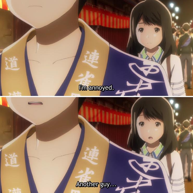 Later on, after the festival, Kotaro lets out his frustrations at home, and we’re privy to seeing flashbacks of what might be running through his head. Although he’s unhappy and jealous regarding Hira, we see that his anger isn’t just because of that, or mostly even. The conversation with Hira is the straw that broke the camel’s back, with most of the weight having to do with Akane’s impending move and Kotaro’s worries about how he can meet that challenge. During the festival, he was also hampered by tiredness, hunger, and thirst, as well as worries about his own future.