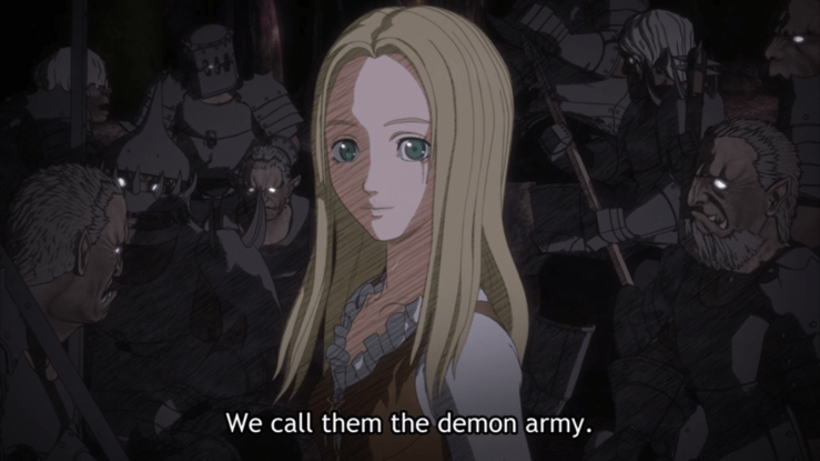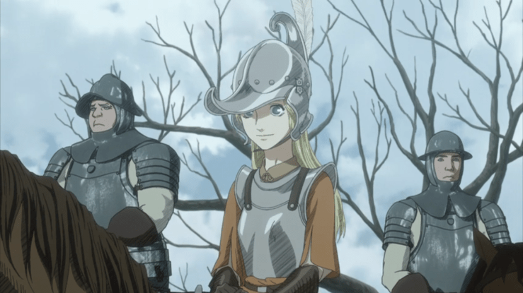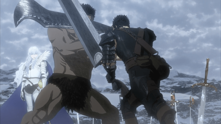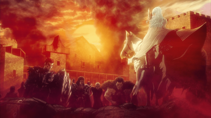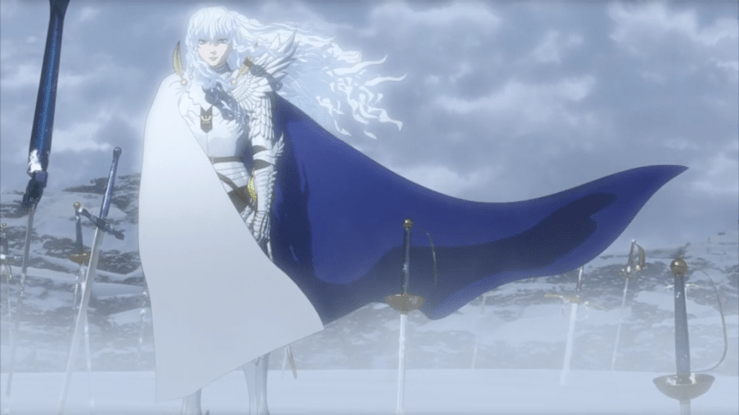 1. The image is quite interesting, but the most interesting thing about it is that it’s not universal. Most pictures with kings in them, which I recall, have the king’s face as part of the picture. (Griffith essentially holds the place of a king.) Most of the time, the focus is on the king. Even when it’s on his subjects, one can usually still see his face at least in profile. Kentaro Miura is renown for the detail his panels contain, and this still frame is likely borrowed from there. What does it mean for Griffith’s face to be hidden in this image? Actually, Griffith is very frequently shown from the back or such that we can’t see his face. Why? I don’t have the answer.