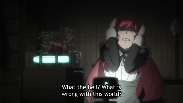 However, I must complain about the treatment of love in WorldEnd, even though this treatment naturally flows from the author’s worldview.  Now, romance is not the product of the West.  (Pace, Welcome to the NHK.)  You can find some very romantic tales in Japanese literature; but, Buddhist principles are not applied to them, and the romances end in marriage, not death.  If one applies Buddhist theology to a romance ending in death, the result is as cruel as if the universe were run by Moloch and Baal.