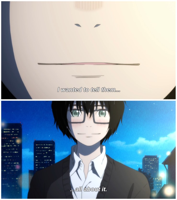 For Rei, one cause of his depression is that he doesn’t enjoy what has become the central focus of his life: shōgi. But because of the people around him, Rei has stared to shift this focus. Shōgi remains of central importance, but family, friends, school, and community are all now budging in. As Thanasis writes in his review, the show is asking us, “What’s more important? What we do or with whom we share the things we do?” Rei’s smile at the end of the episode reinforces something what he’s coming to realize: community is vital. Without it, we’re left living a half-life, one that isn’t where it should or could be.