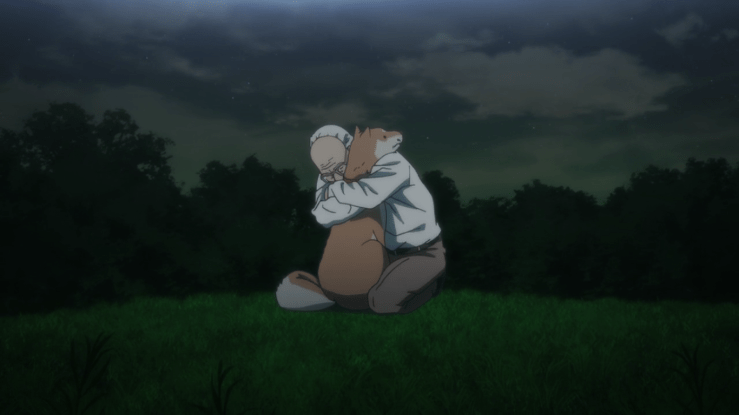 The majority of Inuyashiki episode one focuses on the sorry life the title character leads. Among other things, his family is unloving towards him and others (what family doesn’t want a brand new dog?!), he is stuck in a job where he seems to be unable to progress, and then the big one – he is coldly diagnosed with terminal cancer. Inuyashiki tries to contact his family members about the illness, but they ignore his calls, and by the time he returns home, the old man does what he always does: he internalizes the suffering and makes little of himself, hiding the diagnosis from his wife and instead letting her berate him about the new dog he adopted. It’s only to the dog that Inuyashiki finally confesses his frustration and fear.