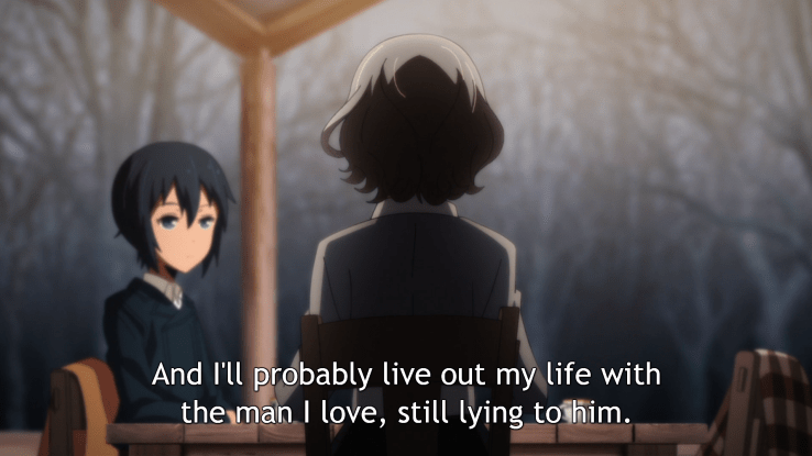 But all these falsehoods, down to the citizens trying to keep their friend from hurt, are all based in love. All the people in the town, all the liars, carry a burden. I’ve asked the question before about whether it’s ever okay to lie; this week, I want to focus instead on the reason for that lie—on love, and especially because there were some tender moments in this series that I thought were pretty heartfelt. It made ponder the nature of love and wonder how I would describe it using the best wording I could and in a succinct manner. And so I lay that same question out before you: