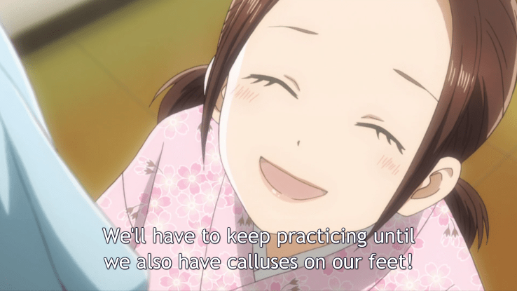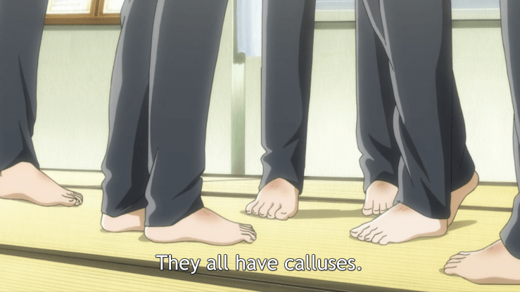 ** I would be remiss if I also didn’t mention the beautiful scene of reinstatement at the end of episode ten. By running after Desktomu and then knelling down and readjusting his obi, Kana serves her teammate and reminds him graciously that he is still part of their team, before explaining about the callouses. Overwhelmed, Desktomu finally repents and congratulates Kana on her victory, bringing her to tears. After that, the response to his actual ask for reinstatement to the rest of the team is a given.