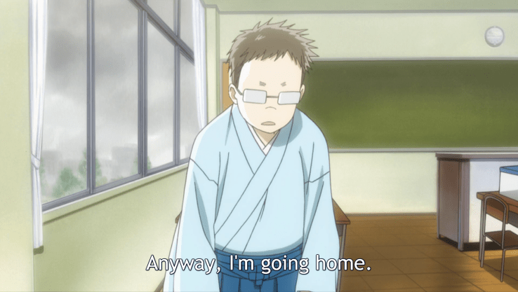 But Desktomu’s frustrations don’t just stay within—he does something shocking and dreadful to the team. He quits on them. The continual losses plus Kana’s victories plus Porky’s unsubtle advice that Desktomu should be paired against the top player on competing teams to take a strategic loss pushes him over the edge. He walks away, forcing Mizusawa to play their next match four-on-five.