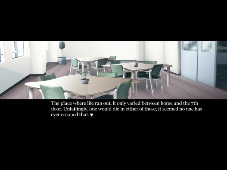 Tomo: That hospital also had a hospice on the 7th floor, like in the games. I regularly visited there for a year’s time. The rooms, lounge, how the helpers were, I think they’re very much like how it was written in the game. [TL Note: It’s unclear, but most likely he is referring to someone else about the hospitalization while he was a visitor]