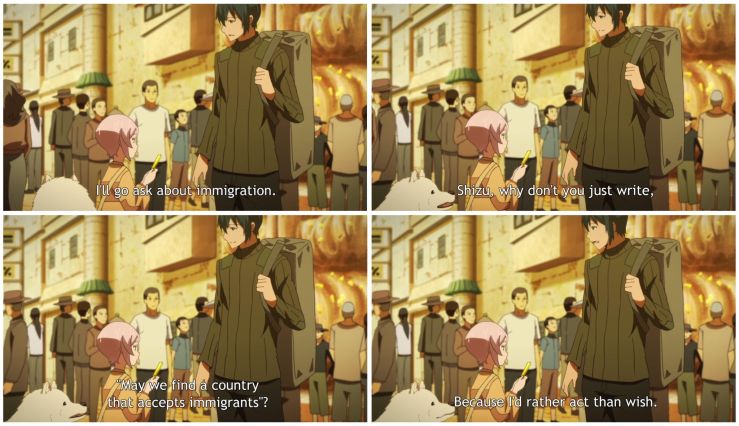 While wishes and prayers aren’t quite the same (though in some faiths they may be more similar than in others), the reaction of Shizu and Ti reminds me of how many react toward prayer. When a tragedy happens, and there’s an outpouring of “Pray for _____,” there’s also a backlash against said sentiment. Pray?! Why don’t you actually HELP?
