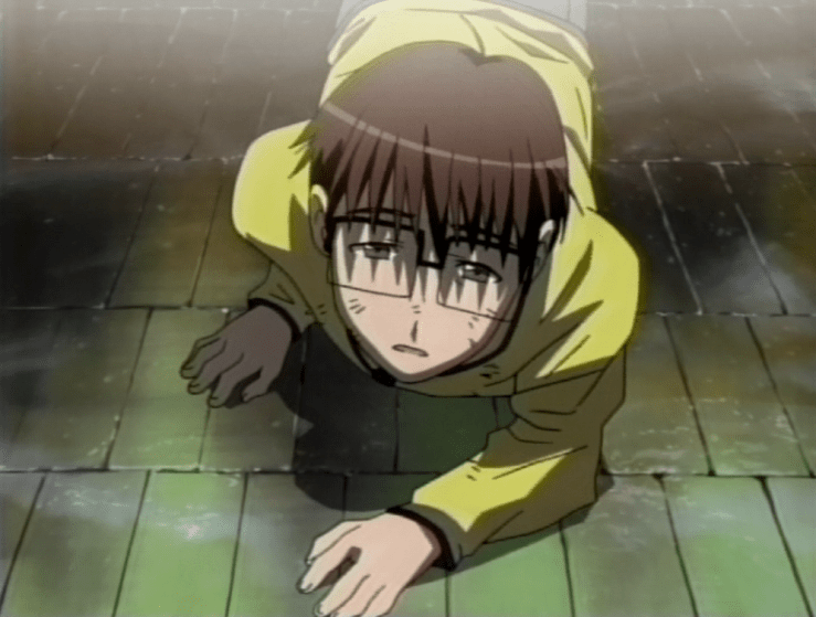 Kietaro gets trapped in this frame of mind during the Love Hina X’Mas Special. At first, though, he has a lovely goal: he wants to get Naru a Christmas dress that he know she likes. And as he’s wont to do, Keitaro approaches this effort with gusto. But then, the ugliness of the holidays and life starts to etch away at him. He breaks his leg. He has to work a part-time job (while Naru is disappointed that he isn’t spending the time studying instead). He sees Naru giving a gift to his romantic rival. By this point, Keitaro is exhausted, hurt, and depressed, and to top it all off, he falls down (remember the broken leg) on a busy street.