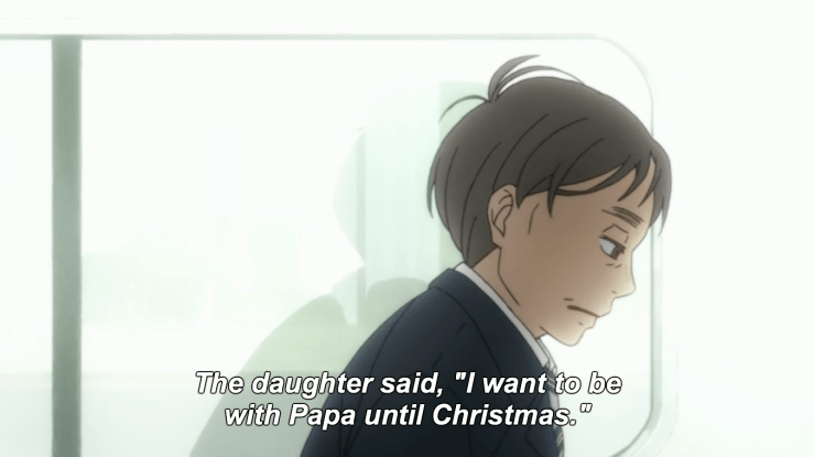 Even if the episode doesn’t have a terribly great sense of the Christmas joy, Rei portrays the spirit of Christmas beautifully in how he tries to help Mr. Yasui. Even after all the psychological pain of going into the shogi match, Rei knows that logically, he can’t just lose the game for the sake of this man and his family. Shogi is his livelihood. His desire to support himself is stronger then his sister’s manipulation. But Rei is connected to this man deeply. They share the bond of shogi and a bond of being in pain. Rei can identify depression in others easily since it lives so strongly inside him.