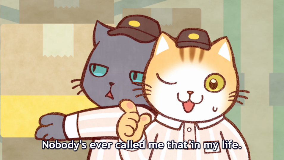 Working Buddies! (Hataraku Onii-san!) is a short form-anime series about anthropomorphic cats doing odd jobs during college. Our two main cats are an energetic calico named Tapio Chatorazawa and the pessimistic Russian blue Kuehiko Roshihara. The first episode shows our two lead cats on the job delivering packages. The entire episode goes from the warehouse to our crew on the job delivering after Tapio introduces the cast to us. That’s pretty much the episode as it’s a 4 minute short.