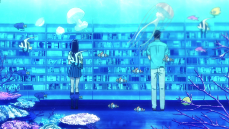 Akira tries to get Kondo to direct her toward his favorite books, but he tells her some good advice, that she should find a book she’s drawn to, less she check out one that she doesn’t like, which might sour her (someone who’s not a reader) on reading. In fact, Kondo says that books call to us, setting up an interesting scene in which Akira imagines the “sea of books,” as the manager describes it, as a literal sea.