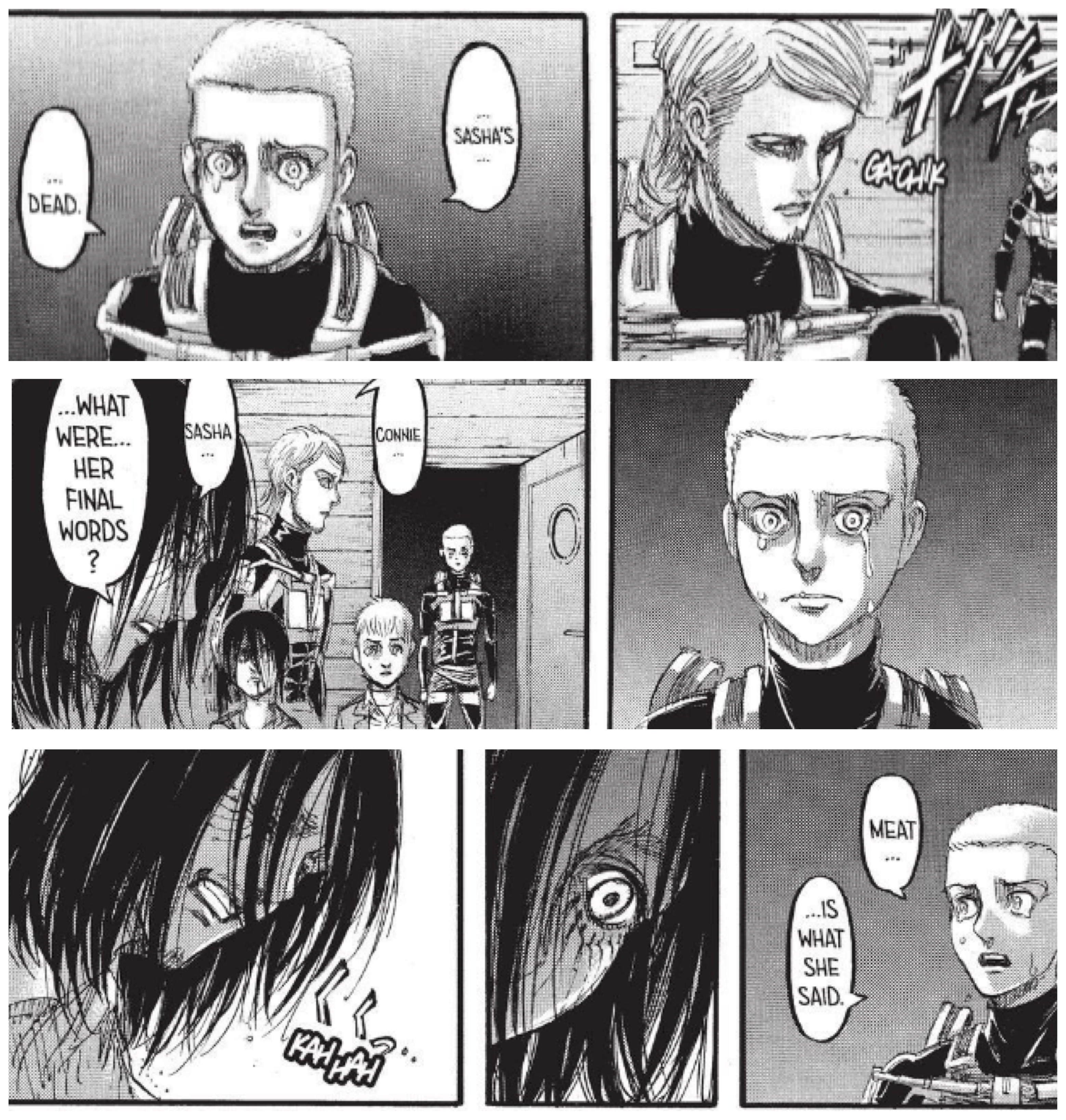 I’m not sure how shocking this moment is to the readers: I was spoiled beforehand and was ready for it to occur. And perhaps those who weren’t spoiled have already had their senses dulled by so many deaths preceding this one. But at least one person—or one character—wasn’t ready for it. Eren reacts with surprise and a little craziness at her pronounced death. He thought they got away relatively scot-free; instead, he lost one of humanity’s best soldiers, and an old friend.