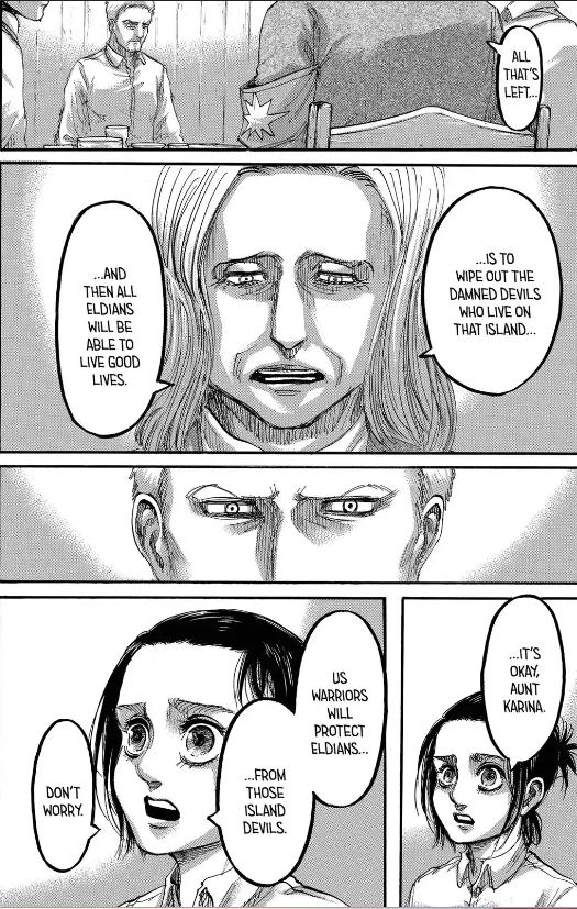 What’s funny is that Reiner himself didn’t know the whole truth. Indoctrinated while living in the Eldian camp (there’s some irony in Isayama directing his story this way btw) about the evils of those living in Paradis, Reiner of course discovers otherwise when joining the 104th Cadet Corps. As Eren later confirms to Reiner, the two are the same, discovering that people are people anywhere, good and bad and all shades in between.