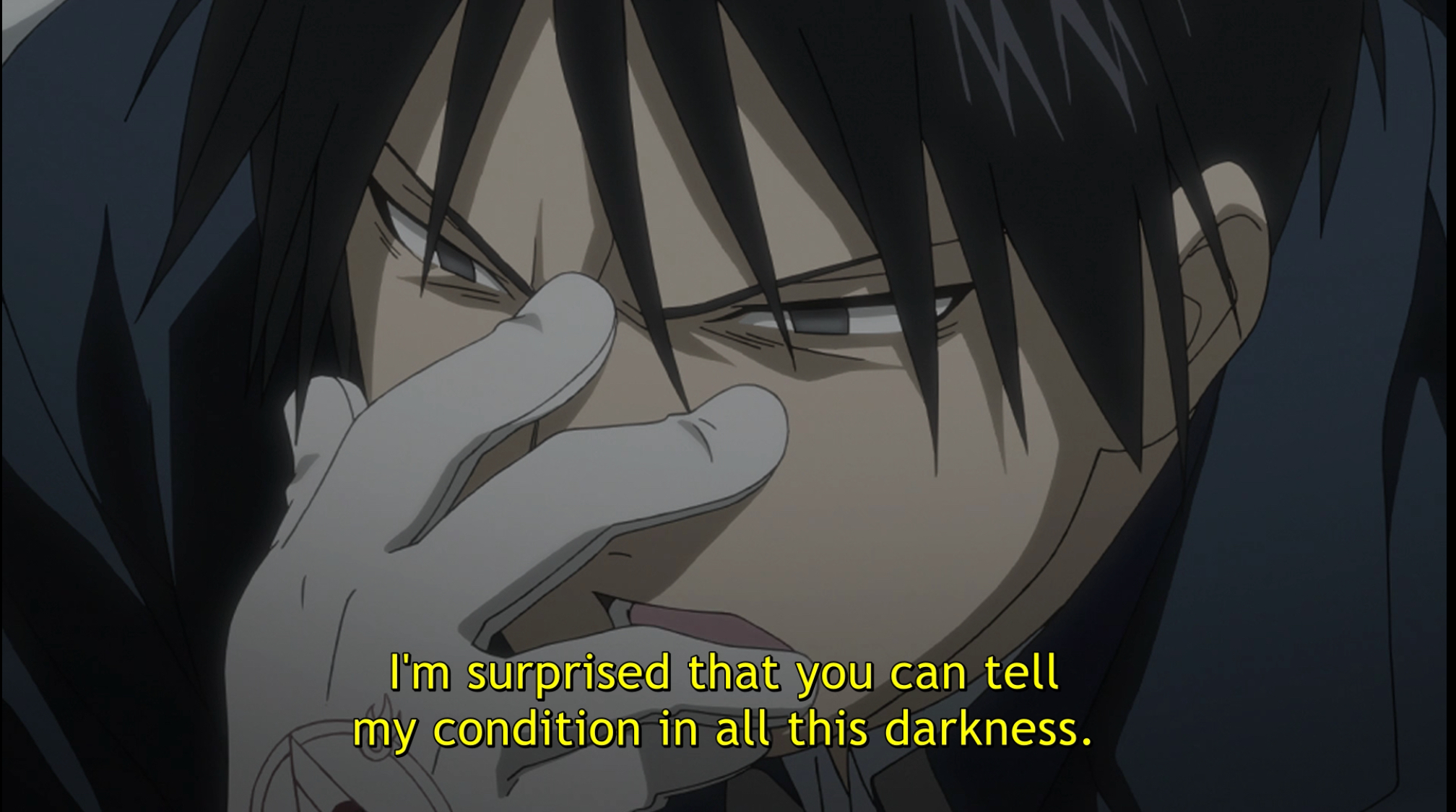 - I’ve mentioned before that the manga is harsher in tone than the series, but in this episode, we get a powerful and painful moment (actually another I should say after a recent death)—Mustang losing his sight is a pretty rough one to endure.
