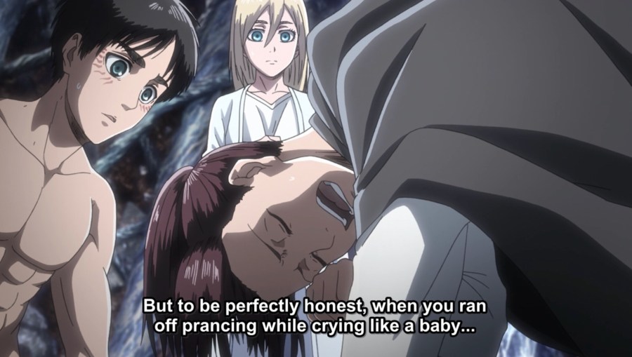 I really don’t like Eren as a character and have happily enjoyed many episodes of him being tied up and quiet, but in this instance I’m going to side with him. His mother was eaten in front of him and then we skip ahead to Eren being old enough to join the military. In the meantime his father has disappeared. We don’t know where or why but the end result is Eren has been abandoned. Thinking about everything he’s been through since then, plus the memory of Eren being the one to eat his father after his father turned him into a monster, I’m pretty sure we can justify trauma and just being overwhelmed as a reason that Eren wasn’t really in the mood to wonder about what his father’s motive might have been right at that particular moment.