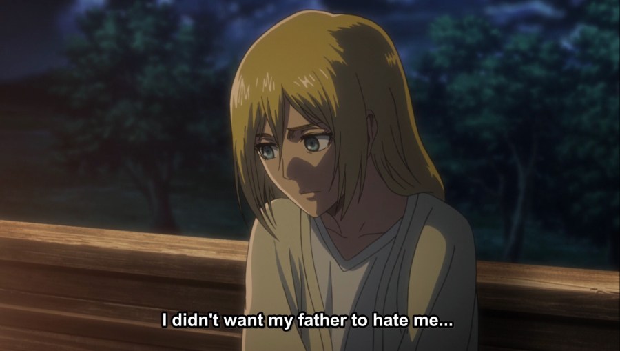 In the Attack on Titan world, bad dads abound. The giant elephant—or titan—in the room being Historia’s father, Rod. And actually the two children, Historia and Eren, make a great contrast. The series has been comparing them since episode one of season three, and the lines of similarity and difference work well in so many cases, right up to their fathers. And like Eren, Historia is easily convinced of a story about her father, though it’s Rod that relates it to her, rather than Eren hearing it second-hand through him.